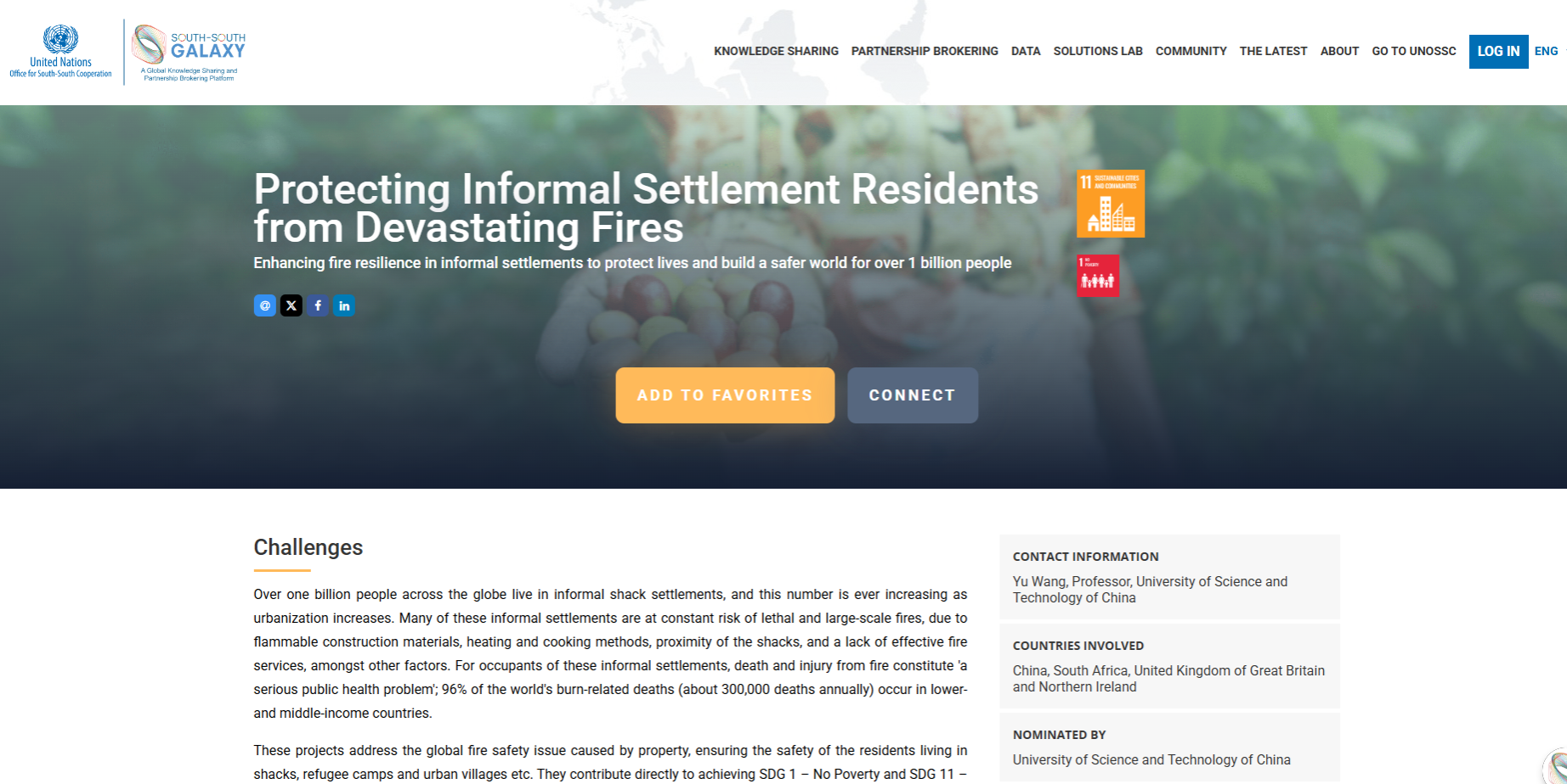 Recently, the fire safety resilience research on informal settlements (such as slums, refugee camps and urban villages) jointly conducted by the University of Science and Technology of China (USTC), University of Edinburgh (UK) and Stellenbosch University (South Africa) was selected by United Nations Office for South-South Cooperation (UNOSSC) as a Good Practice in South-South and Triangular Cooperation. This research was officially featured as a Solution on South-South Galaxy (UNOSSC’s global knowledge-sharing platform) on the 10th of November. UNOSSC presents Good Practices as great examples of South-South and triangular cooperation that showcase innovative, impactful, and scalable solutions, demonstrating collaborative efforts among countries of the Global South as well as supported through triangular cooperation involving traditional donors, multilateral organizations, and developed countries. This is the first Good Practice and Solution on the keyword of “Fire Safety” by the UNOSSC, and the first time our university's research results have been selected.