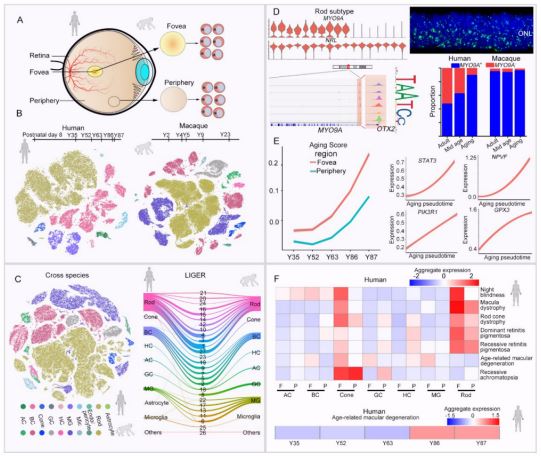 Researchers collected 119520 cell transcriptomes of human and macaque retina from young to old. Firstly, by comparing the human and macaque retinal cell composition and regional molecular differences, researchers found that though rods of humans and macaques can be both divided into two subtypes by MYO9A expression, the proportion of MYO9A- cells varied between the two species.