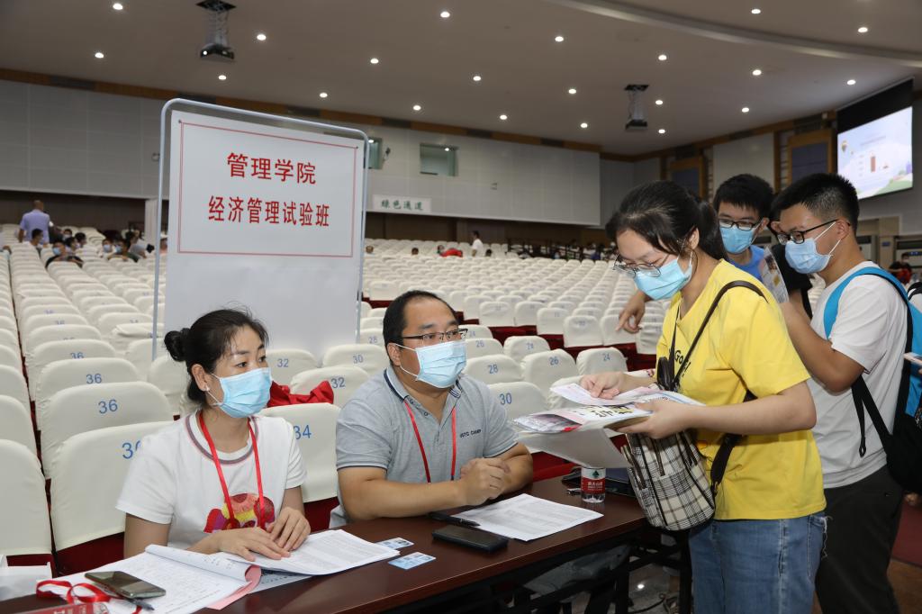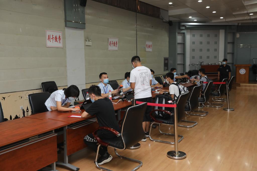Different departments cooperated together and adopted various measures to provide a safe and humanized service. Freshmen lined up outside the east auditorium with a distance of one meter each person, and a designated person was responsible for the regular sterilization. Different check-in points, such as the payment channel, green channel, were all in order. The number of students who were in the different status of the registration process was scrolled in real-time on a large screen.