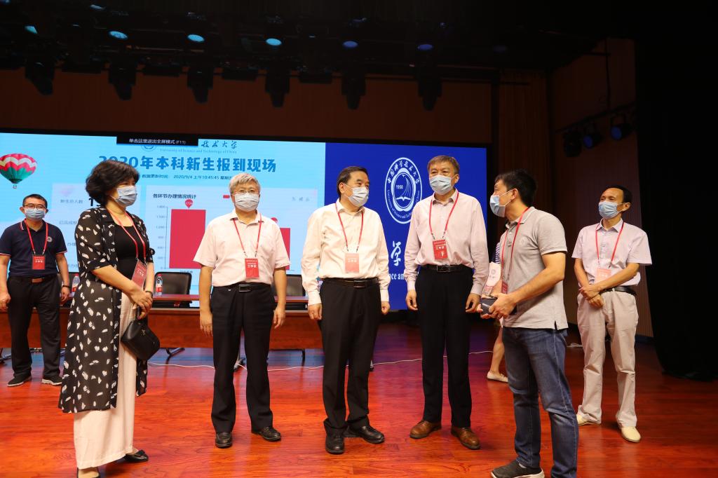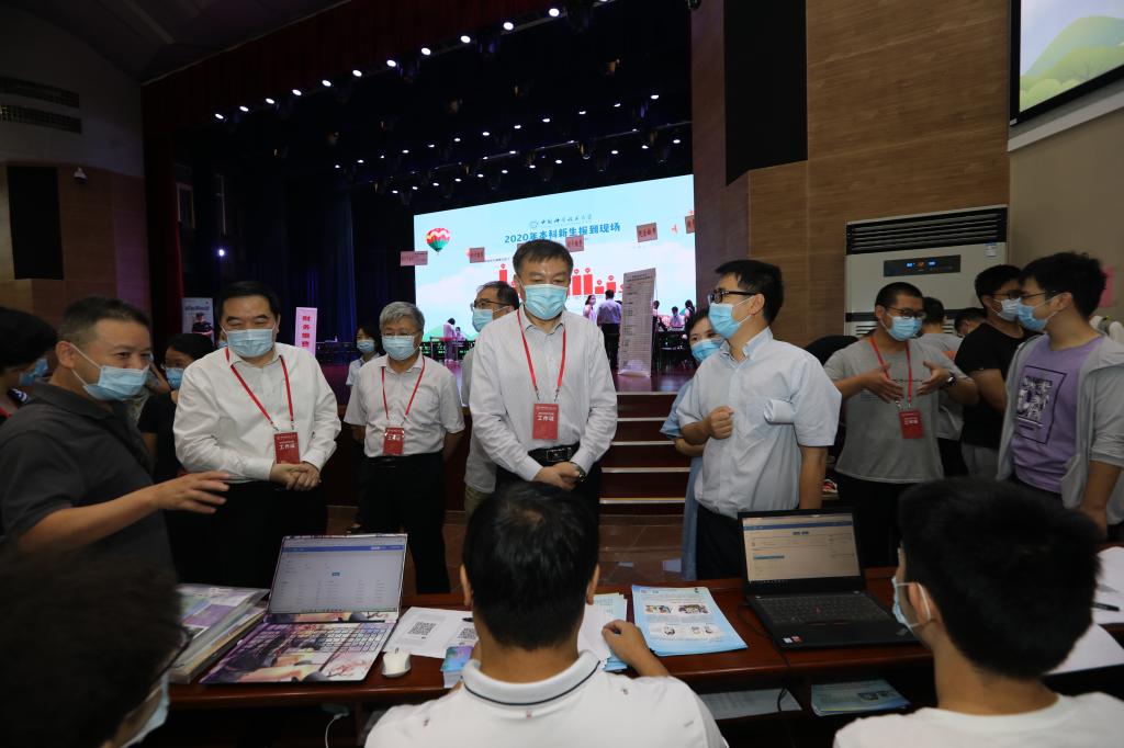 Party secretary SHU Gequn, president BAO Xinhe, vice president ZHU Changfei and WANG Xiaoping, chief accountant HUANG Sufang and other leaders went to the registration sites in east, west and central campus to visit the freshmen in the morning. In addition to sending their regards to the staffs and volunteers, they emphasized that in the meantime of preventing and controlling the epidemic, the registration process and the resumption of classes should be well organized.