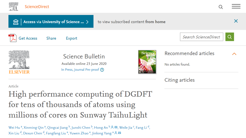 Prof. YANG Jinlong and Prof. AN Hong from University of Science and Technology of China (USTC) of the Chinese Academy of Sciences (CAS), along with domestic collaborators, have realized first-principles computing simulation of the large-scale solid system with tens of thousands of atoms and molecules based on Discontinuous Galerkin Density Functional Theory (DGDFT), a high-precision computation software, with the help of super large-scale millions of cores parallel computation on the supercomputer Sunway TaihuLight. The study was published online on Science Bulletin.