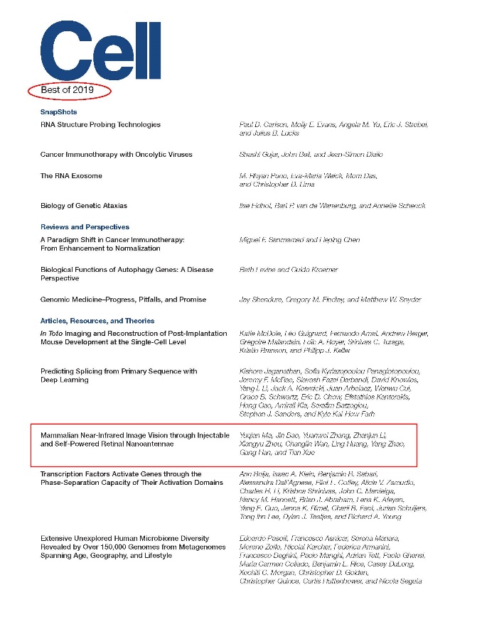 The paper entitled "Mammalian Near-Infrared Image Vision through Injectable and Self-Powered Retinal Nanoantennae" published by Prof. XUE Tian of the School of Life Sciences from USTC was awarded as "The Annual Paper in China of Cell Press in 2019". Mammals can only see visible light (usually referred to wavelengths between 400 and 700 nm). In fact, there exists longer wavelength light (such as infrared) in our environment, and the detection of it helps us obtain information beyond the visible spectrum. However, the infrared night vision for detecting infrared light has the disadvantages of being incompatible with visible light, easily overexposed in strong light, and requiring power supply.
