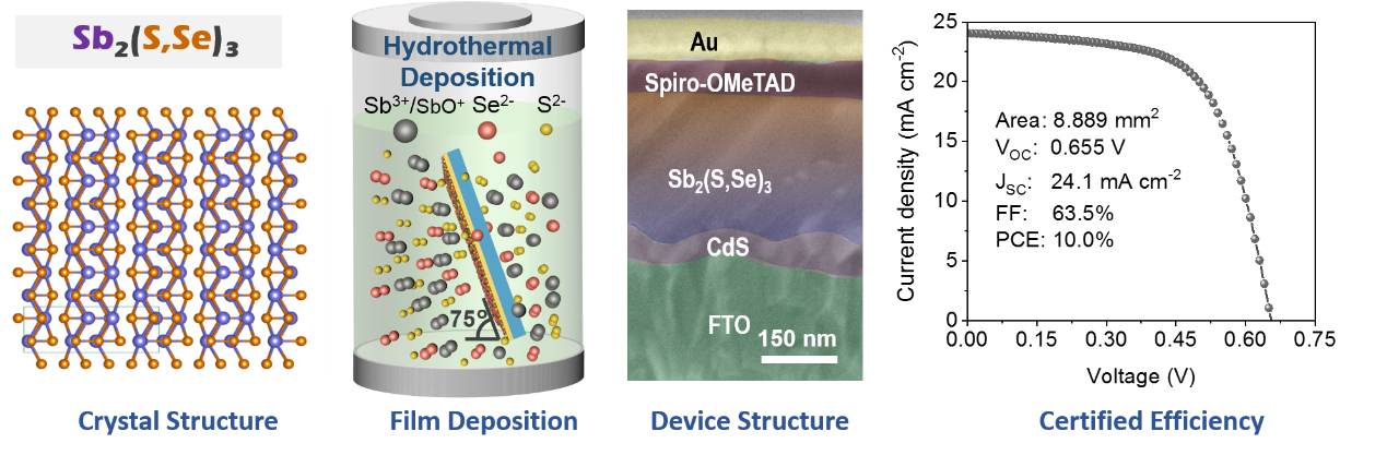 Consider that Sb2(S,Se)3 is consisted of earth-abundant elements and with the excellent stability, the improvement in breaking 10% benchmark efficiency will set a ground for commercialization path. In this study, the authors found that the hydrothermal deposition at supercritical condition enables the generation of compact and flat film with homogeneous element distribution in the lateral direction. These superior characteristics allow the efficient carrier transport and suppression of the detrimental recombination. With further optimizations of the band gap, cation/anion ratio, crystal orientation and defect properties, the device successfully achieves a record power conversion efficiency.