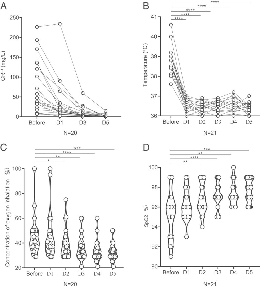 In the research, 21 patients who were the first to use Topiramab in Fuyang Second People's Hospital and the First Affiliated Hospital of USTC were observed. The patients ranged in age from 25 to 88, including 17 severe cases and 4 critical cases. Their first symptom was fever and the average temperature was 38.8 ± 0.6 ℃. There was a 1-week history of routine treatment before the use of Topiramab, but the symptoms did not improve. After 5.6 days on average, all the patients had different degrees of deterioration with sustained fever and hypoxemia. CT of lung showed the progress of lesions. Among them, 2 cases were intubated and 1 case was non-invasive. On the first day after the treatment with Topiramab, the body temperature of all patients returned to normal, then remained stable, and the clinical symptoms were relieved significantly in the following days. The respiratory function of most patients was improved to some extent, and the chest tightness was relieved. 75% of the patients decreased the oxygen flow rate within 5 days, and the oxygen saturation of the peripheral blood remained stable. Two patients were evacuated from the ventilator within 5 days after receiving Topiramab. Most of the inflammatory indexes such as the number of peripheral blood lymphocytes and C-reactive protein recovered within 5 days. All patients have been discharged from the hospital, and the average hospitalization time after using Tuozhumab is 15.1 days. There were no adverse drug reactions and secondary pulmonary infection during the treatment.